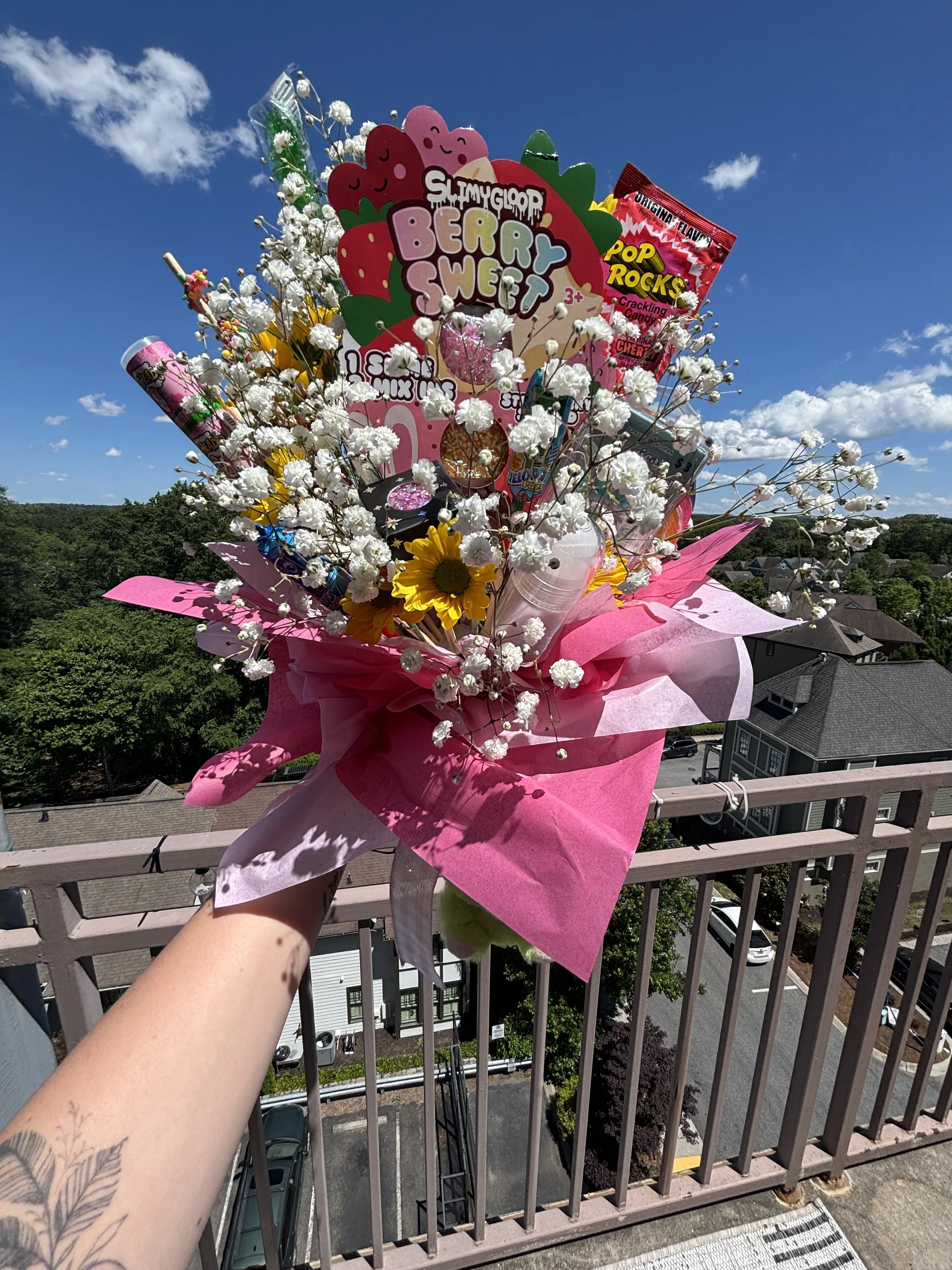A pink bouquet with white baby's breath and yellow flowers, containing various colorful candies and toys, held up against a bright blue sky with clouds from a balcony view of rooftops and trees.