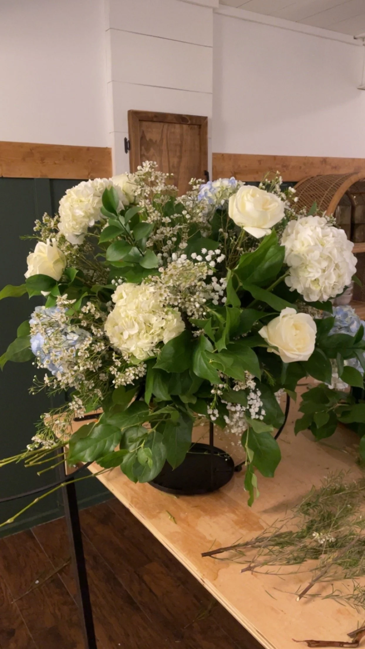 A floral arrangement featuring white hydrangeas, roses, baby's breath, and greenery on a wooden table.