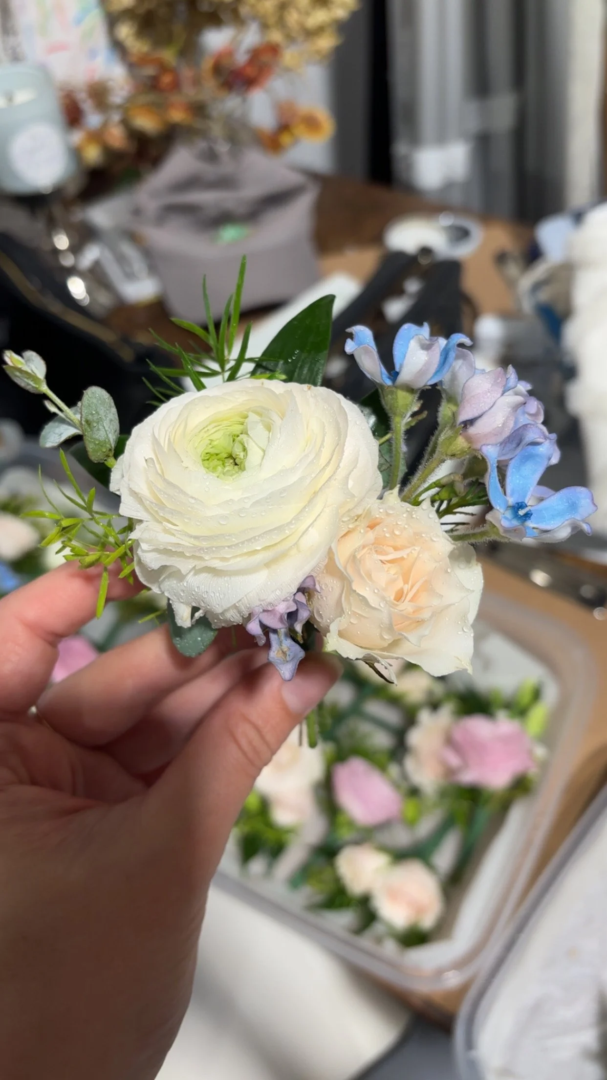 Close-up of a small floral arrangement with white and peach roses, blue delphiniums, and greenery, held by a person's hand.