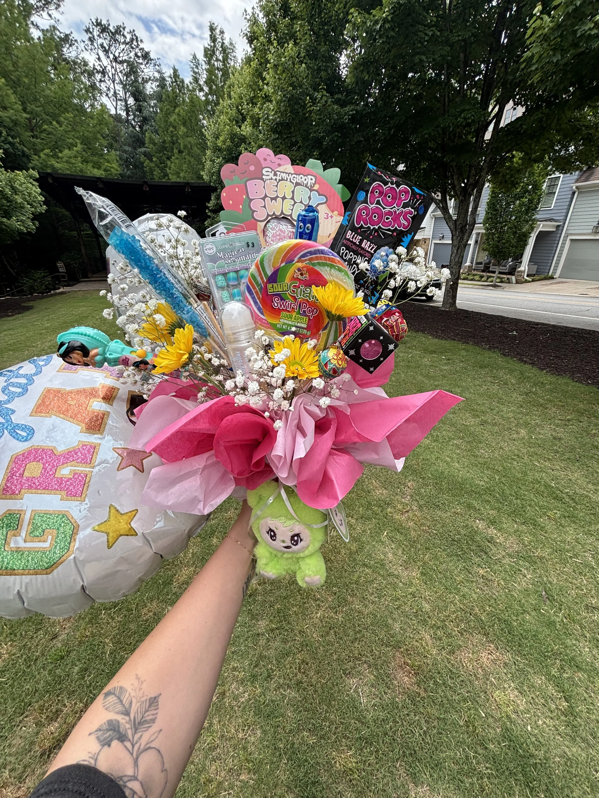 A colorful balloon bouquet with toys, candies, and flowers being held outside on a grassy lawn with trees and houses in the background.