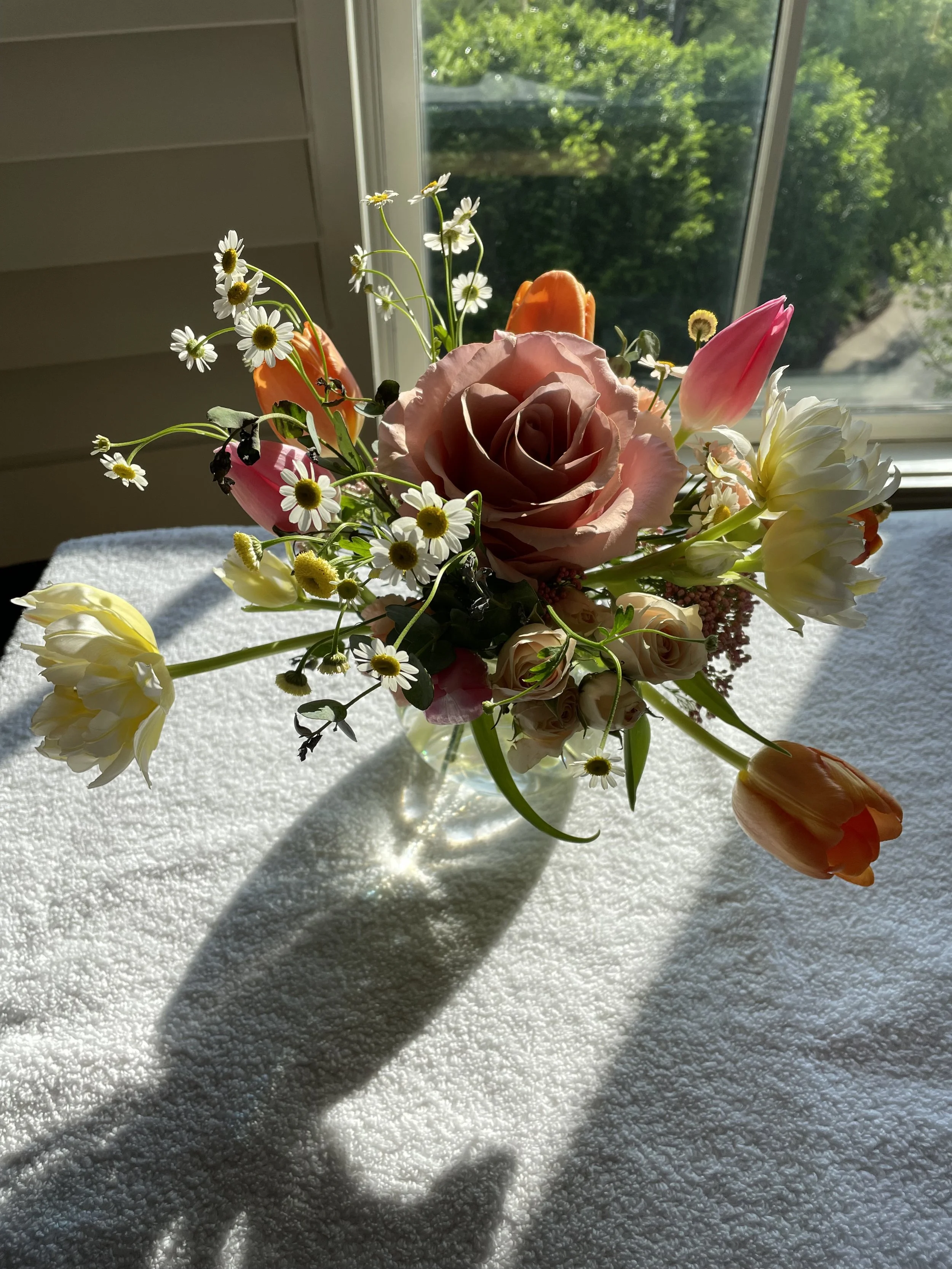 Flower bouquet with roses, tulips, daisy-like flowers in a glass vase on a white textured surface with sunlight and shadows, near a window with greenery outside.