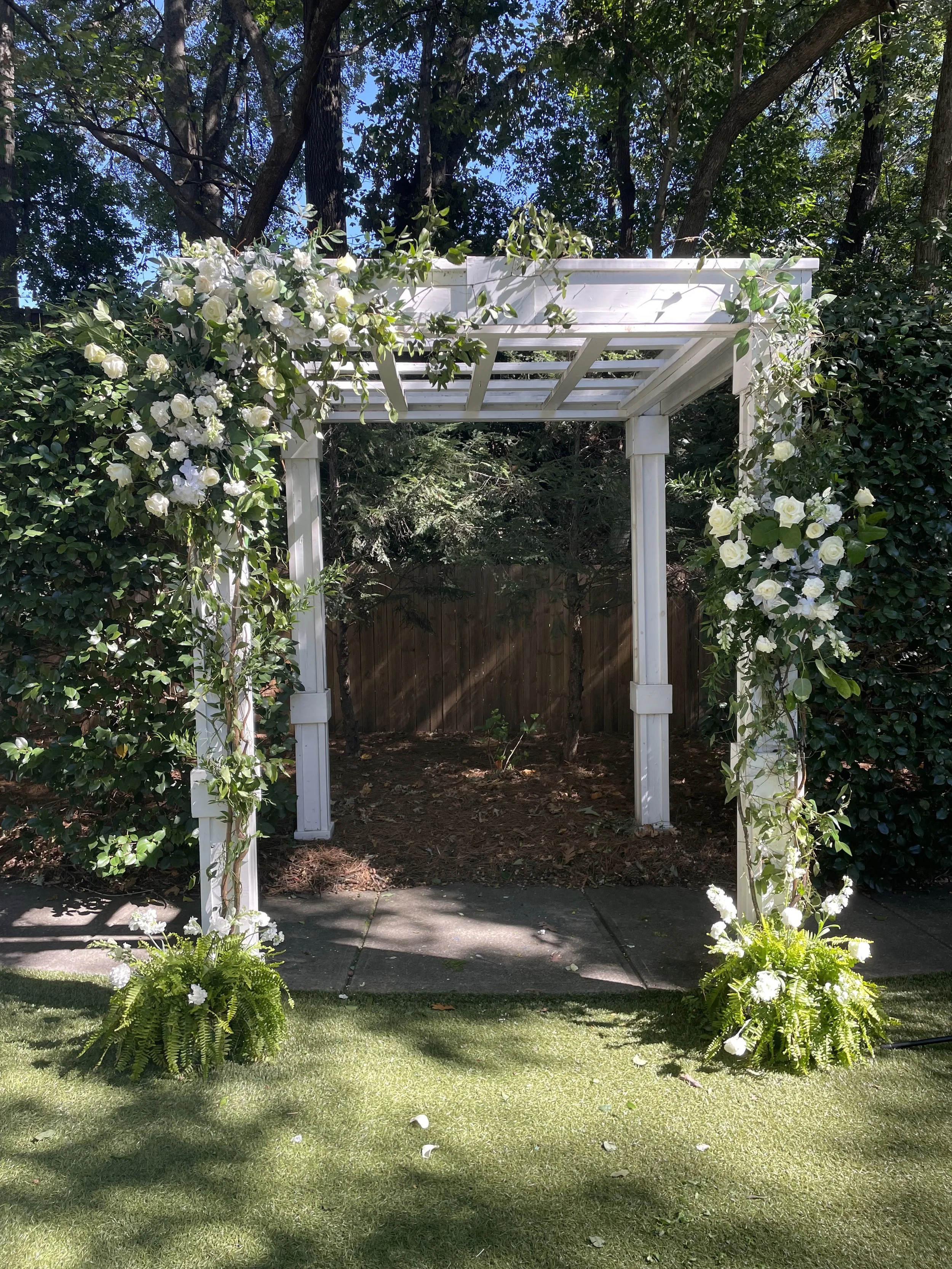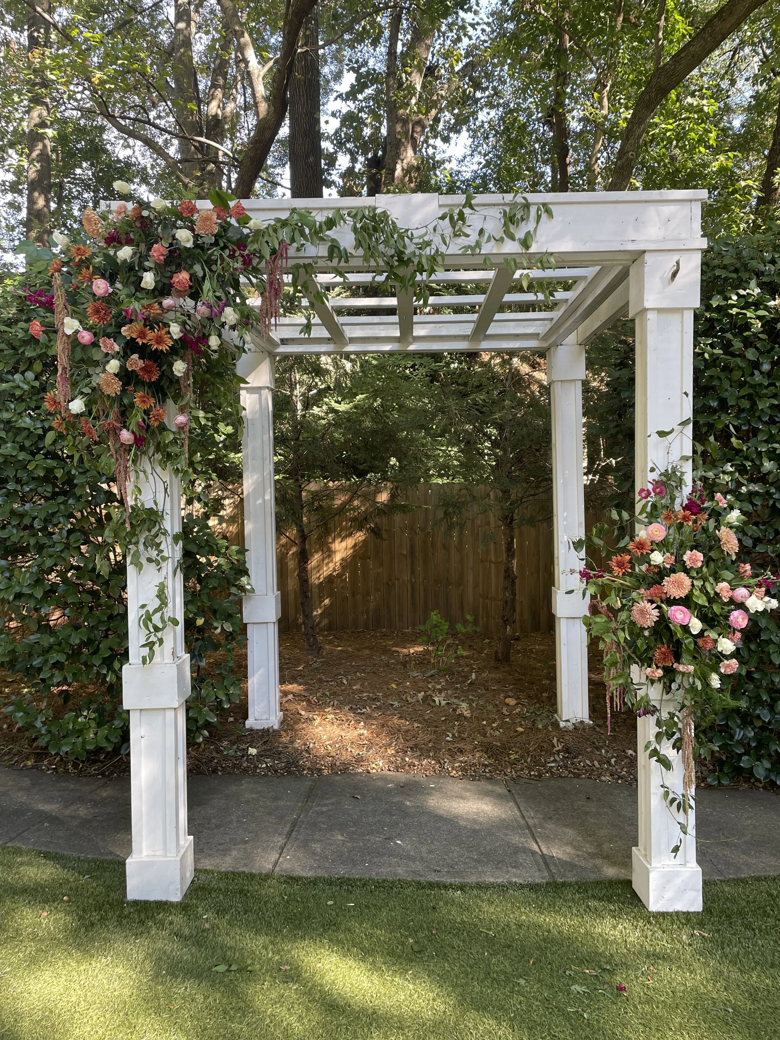 A white garden arbor decorated with colorful flowers, situated on a concrete patio with a lawn in the foreground and a wooden fence behind, surrounded by trees and greenery.