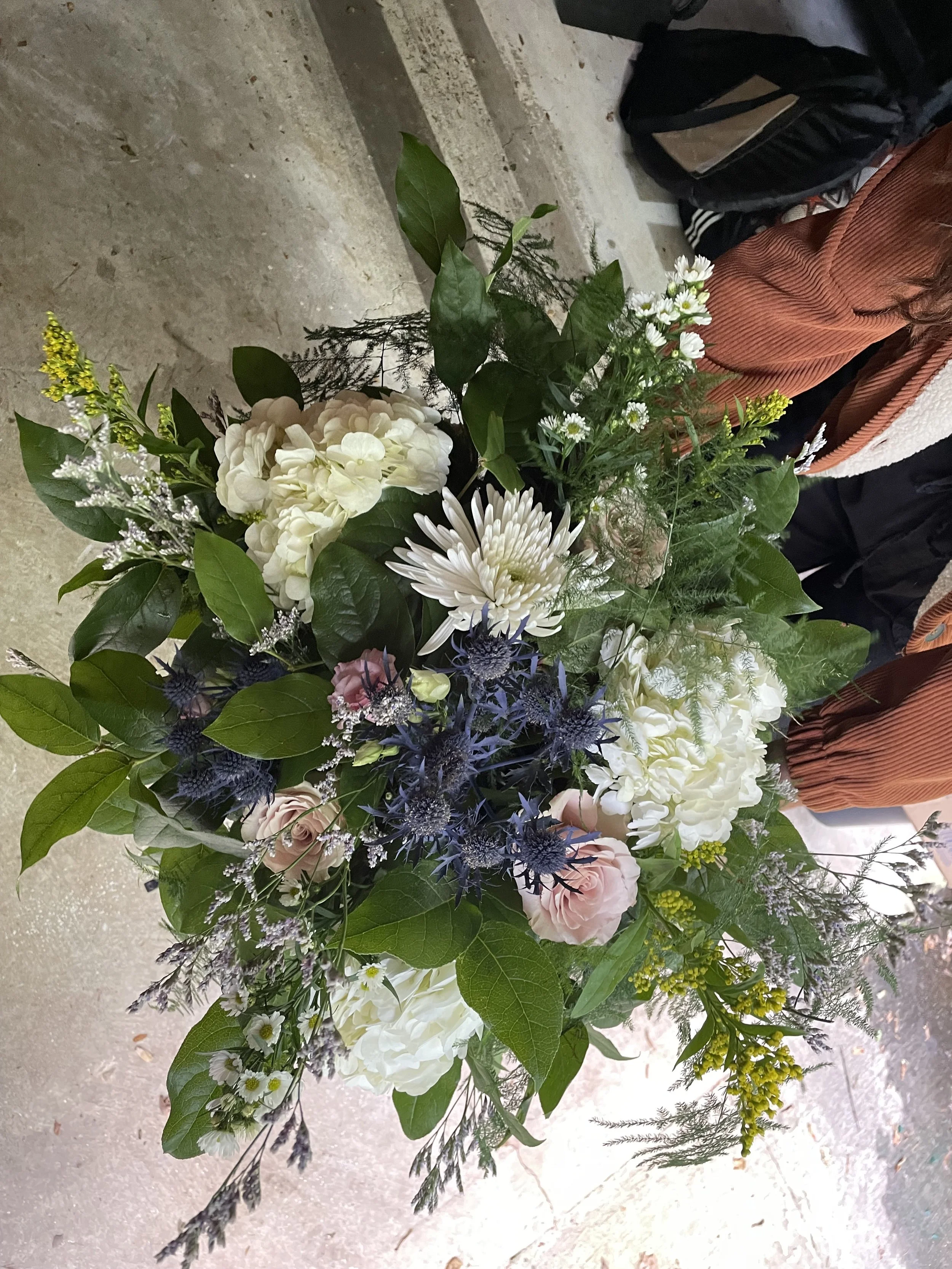 A colorful bouquet of various flowers including white hydrangeas, pink roses, white daisies, purple thistles, and green foliage.