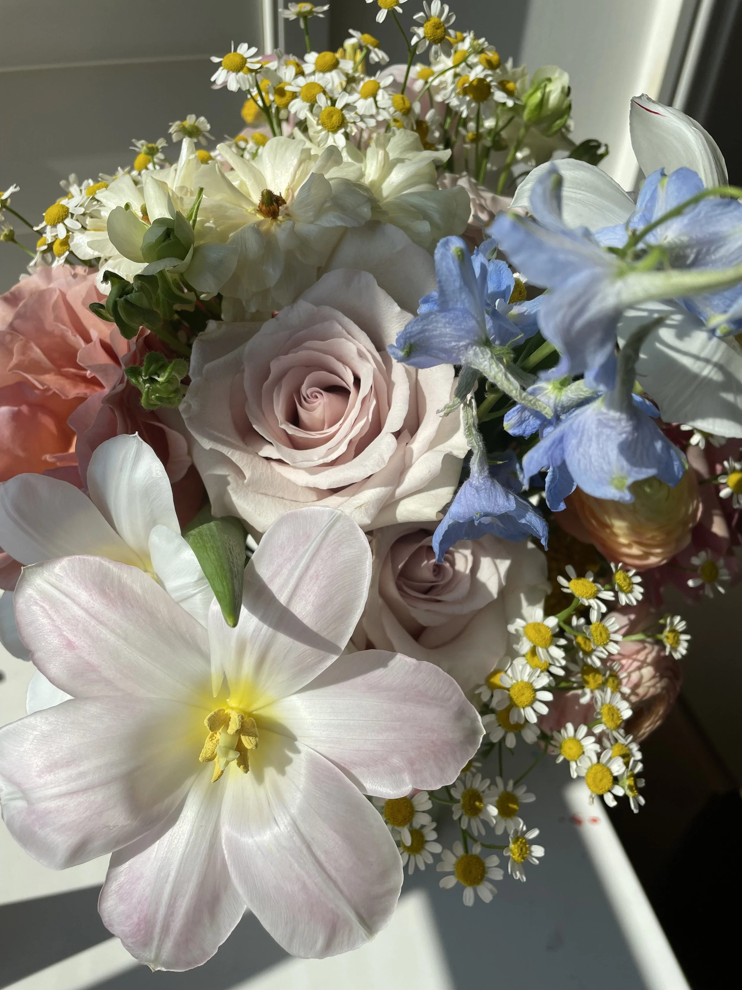 A close-up view of a bouquet of various flowers including daisy-like flowers, pink roses, blue flowers, white lilies, and assorted greenery with sunlight shining on them.